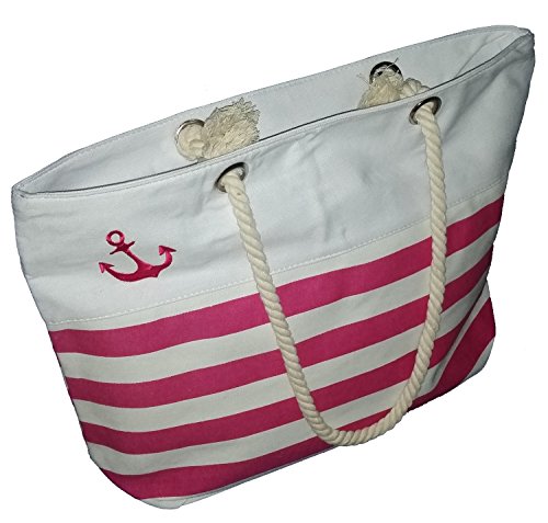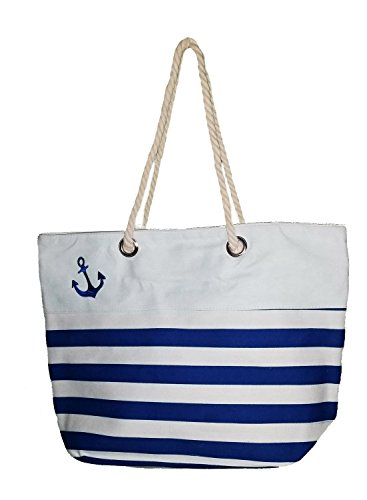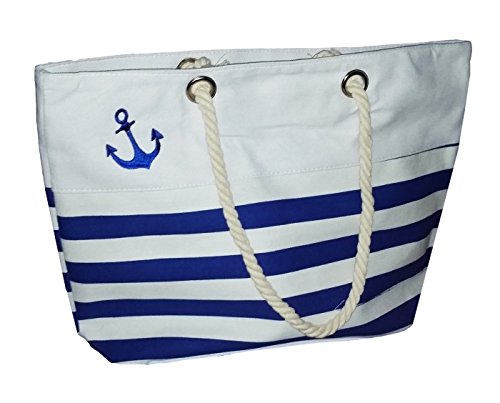 -. Feature : Dimensions: 19.25" x 13.5" x 6" / Canvas Striped Tote with Zipper Closure / Heavy Duty Rope Handles / Embroidered Anchor Accent / Lined with Interior Zippered Slip Pocket