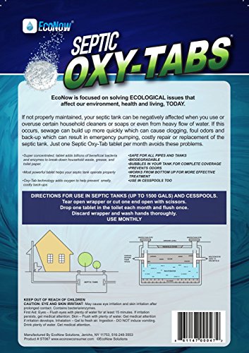 -. Feature : Powerful, concentrated tablet adds beneficial bacteria, enzymes and OXYGEN to effectively treat , maintain and clean your septic tank / ProP.R.Ietary Oxy-tab technology helps prevent back-ups and eliminates foul odors / Time release additive fizzes to cover your entire septic system / Tablet works from bottom up to effectively treat heavier solids / Environmentally friendly, non-hazardous and biodegradable