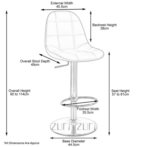 -. Brand : Zuri Furniture -. Feature : Overall: 18 inch(W) x 19 inch(D) x 46 inch(H) / Seat: 18 inch(W) x 16 inch(D) x 18 inch(H) / Bar stool features a brushed stainless steel base and an adjustable seat height to fit any counter. / Overall Height Range: 35" to 45" - Seat Height Range: 22" to 32" / Additional color swatches available. Please contact showroom for more information. -. Label : Zuri Furniture -. Manufacturer : Zuri Furniture -. ProductGroup : Furniture -. ProductTypeName : HOME_FURNITURE_AND_DECOR -. Publisher : Zuri Furniture -. Studio : Zuri Furniture -. Title : Rochelle Adjustable Height Swivel Armless Bar Stool with Brushed Chrome Base