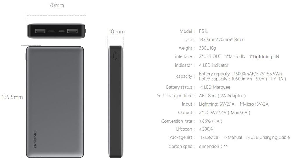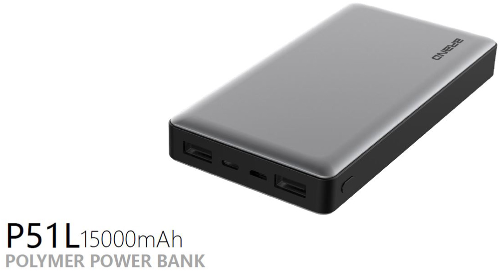 Hame P51L dengan kapasitas 15000mAh ini memiliki 2 buah port output. Metode input Power bank ini juga dapat menggunakan kabel Lightning ataupun Micro USB. Power bank ini disertai dengan indikator untuk mengetahui sisa daya pada power bank.