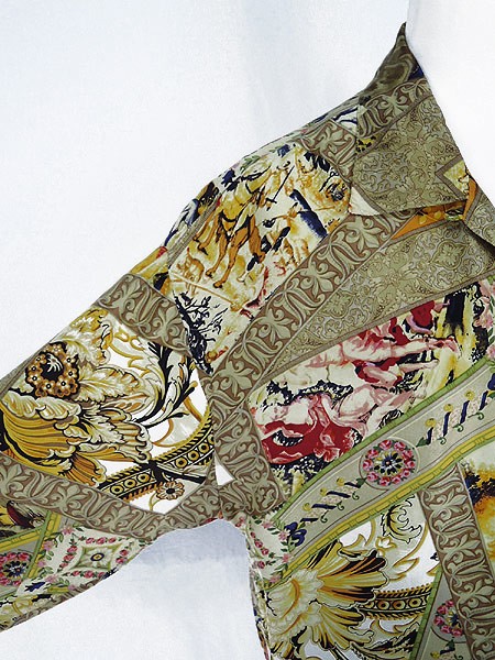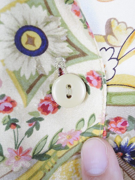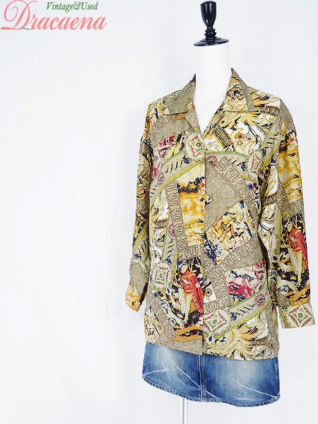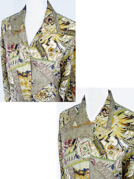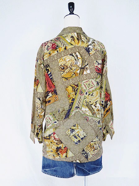 Ladies ブランド カラーカラフル・ゴールド メール便不可 コンディション★★★ 素材シルク 表記サイズXS 実寸サイズ 着丈 58 cm 身幅 51 cm 肩幅 49 cm 袖丈 49 cm ※ウエスト・ヒップ以外は平置き採寸