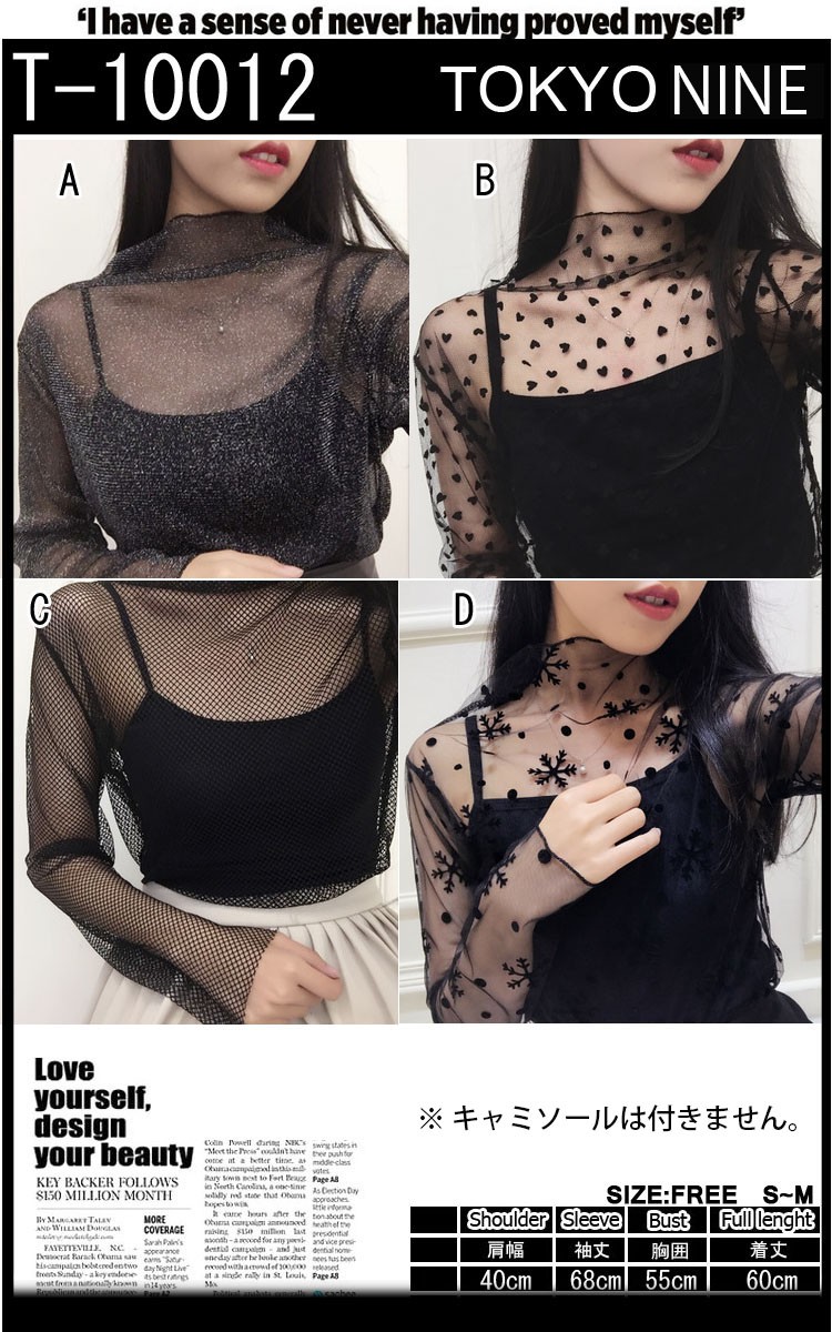 【サイズ】レディース フリーサイズ ※詳細はサイズ表記をご参考下さい。 【素材】コットン ポリエステル 【色・デザイン】トレンド 4デザイン,1カラー ・ブラック ※キャミソールは付きません。 【注意事項】 モニターの発色具合によりお色目が異なります。 【商品の特徴】 個性的なデザインがお洒落なトップス☆ 透け感がセクシーに決まります! 4つのデザインでお好きなタイプを選べます♪ これからの季節にピッタリのトップスです! バイヤー完売予測品☆