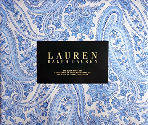 -. Title : Lauren 4 Piece Queen Sheet Set Cotton Blue and White Paisley Pattern on White