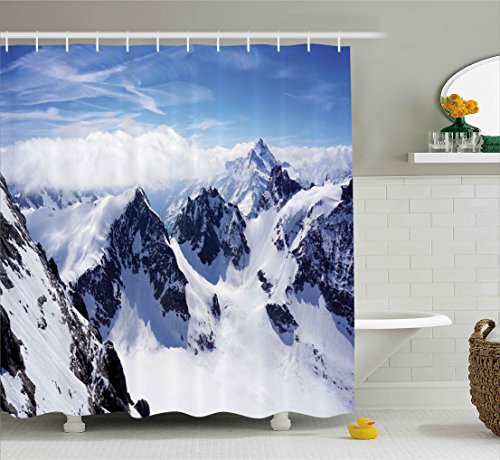 Winter Decor Shower Curtain by Ambesonne, Snowy Mountain Peaks Tops High Lands Northern Scenic Alps Panorama Valley, Fabric Bathroom Decor Set with Hooks, 70 Inches, White Blue