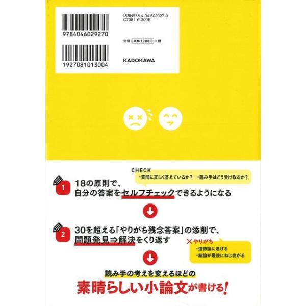 【商品説明】 定価(税込み):1,404円 値引き:10% OFF 「質問に正しく答えているか?」「読み手はどう受け取るか?」など、小論文の成否を左右する18の原則を紹介。「道徳論に逃げる」「結論が最後にねじ曲がる」など、30を超える「やりがち残念答案」を取り上げ、「なぜダメなのか」「どこをどう書けばいいのか」を詳しく解説。 バーゲンブック 新品 特価 格安 語学 辞書 日本語 国語学 日本 | |