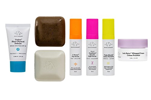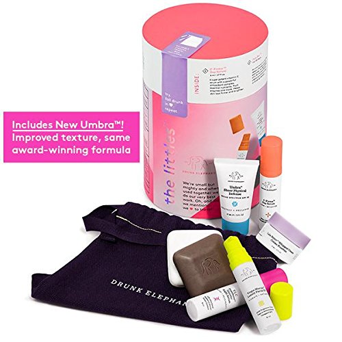 -. Feature : THE LITTLES KIT. Dying to try Drunk Elephant but wanted samples first, or simply prefer travel size? The Littles offer a set of the 7 essentials to nourish, balance, and reset your skin. Ideal for every skin type and tone, including the most sensitive / WHAT YOU GET. This mighty set includes one Pekee Bar, C-Firma Day Serum, Umbra Sheer Physical Daily Defense SPF 30, Juju Bar, TLC Framboos Glycolic Night Serum, Virgin Marula Luxury Facial Oil, and Lala Retro Whipped Cream for a radiant you / NO QUESTION IN QUALITY. A routine is only as good as its worst product, and a product is only as good as its worst ingredient. Drunk Elephant is dedicated to your internal health and external skin health; "If there's any DOUBT, it's OUT." / SENSITIVE VS. SENSITIZED. When skin is exposed to irritants and sensitizers, damage can be imperceptible and cumulative, leaving it in a reactive mode. "Sensitive" skin is often just skin that has become sensitized over time by harsh additives / MADE IN THE USA. Drunk Elephant doesn't take shortcuts or compromise ingredients to save money. They are hands-on and will stay true to their ethos. Their products are designed, tested and made in the United States