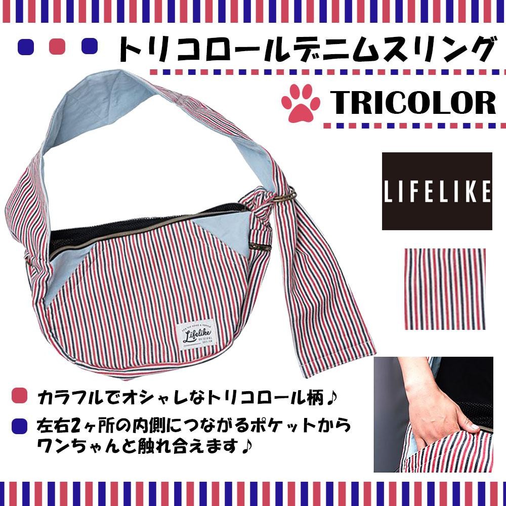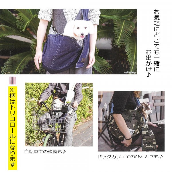 どこでもワンちゃんと一緒にお出かけできるバッグ。2ヶ所のポケットから直接撫でられるようになっています♪オシャレなトリコロール柄。 |