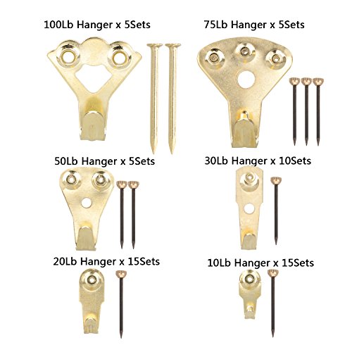 - Picture Hanging Hook Set - 130 pieces including 10 lbs (15pcs) ,20 lbs (15pcs) ,30 lbs (10pcs) ,50 lbs (5pcs) ,75 lbs (5pcs) and 100 lbs (5pcs) picture hangers and 75pcs nails, supports various objects sizes to suit your needs