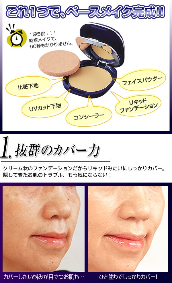 サッと塗ってベースメイク完了!UV下地、コンシーラー、ファンデーション、パウダーがこれ1つでOK!内容量12gサイズ7.6×6.9×2.4cm重量68g 仕様 商品区分:化粧品 販売元:コモライフ(株) 製造国日本