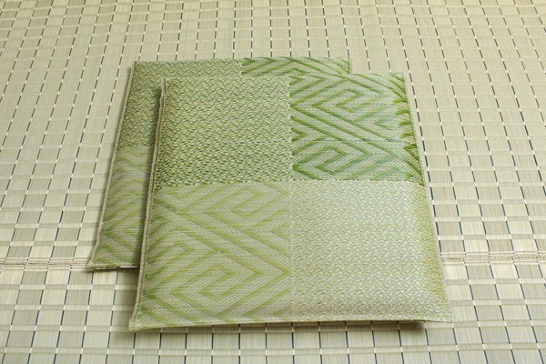 側地は紋織という技法で仕上げております。一般的な敷き物と同じようにイ草を織込み、しっかりとした生地に仕上げました。国産(九州産)のい草を使用しています。一本一本が太く、表皮が厚く繊維がキメ細かいので弾力性があり、耐久性に優れています。い草には空気の自然浄化作用、湿度の調節作用などがあります。また汚れにくく、使用するうちに黄金色に変化し味が出ます。い草に青森ヒバ加工を施しています(抗菌、防臭効果)。中材はウレタンをフェルトでサンドした三層構造で、適度なクッション性があります。