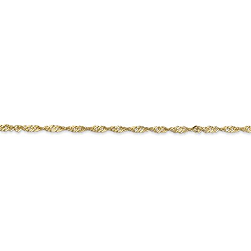 SPECIFICATIONS: Jewelry Type: Anklets, Chain Type: Singapore, Anklet Type: Chain Styles, Material: Primary: Gold, Material: Primary - Color: Yellow, Material: Primary - Purity: 14K, Finish: Polished, Chain Length: 9 in, Chain Width: 1.7mm, Clasp /Connector: Lobster, Feature(1): Solid