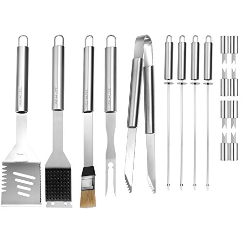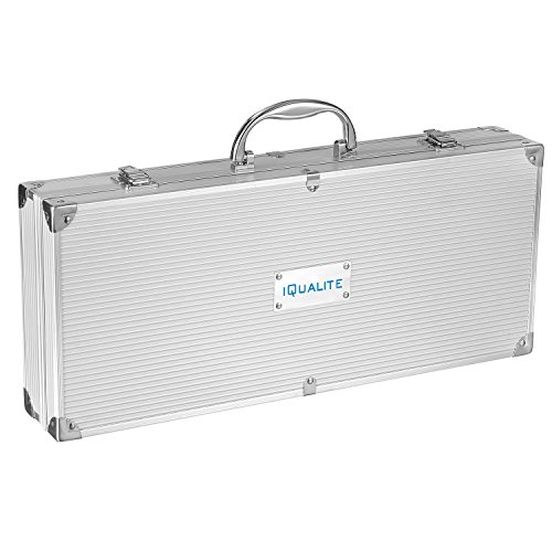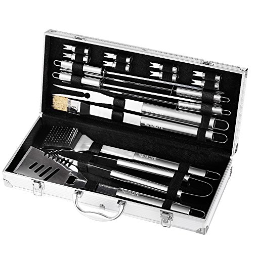 Studio : IQUALITE Publisher : IQUALITE Product Description Grill in comfort style with our exclusive high-quality, premium, Food grade stainless-steel 18 Piece Grill Set Tools. The handle lengths of this tool set keeps you out of harm's way while grilling, but allows you the proximity to be able to cook your food with ease. Strong BBQ tongs allow handling of delicate foods, like fish, without tearing. Sharp grilling fork tines for skewering, safe and easy lifting and turning. Premium stainless steel quality making this barbecue tools set durable and long-lasting, will not bend nor break while using them. Material: Food Grade Stainless Steel BBQ Grill Tools Set Include: 1x Barbecue fork: 42 * 3 cm / 16.5 * 1.2 inch 1x BBQ: 41.5 * 5 cm / 16.3 * 2 inch 1x Grill shovel: 45 * 8.6 cm / 17.7 * 3.4 inch 1x Steel brush: 42 * 6 cm / 16.5 * 2.4 inch 1x Barbecue knife: 40.5 * 3 cm / 15.9 * 1.2 inch 1x Sweep: 42 * 3.5 cm / 16.5 * 1.4 inch 4x Cattle Knife: 24 * 2 cm / 9.4 * 0.78 inch 8x Corn fork: 6.5 * 1.5 cm / 2.5 * 0.6 inch Packing size: 48 * 24 * 8 cm / 18.9 * 9.4 * 3.1 inch, aluminum box packaging. These knives are extremely sharp and cannot be sold to anyone under the age of 18. Always handle knives with care and keep out of reach of children. 0