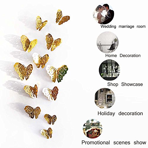 - butterfly at home can be used in TV setting wall; The living room and the dining room wall; The bedroom can also be used; Let the refrigerator's wings beat happily every time it closes. Gold and silver butterfly mix home decoration, shop window display, wedding scene, wedding car; Festival decoration; Parents and children together stick to the butterfly to raise the children's aesthetics and the sense of achievement; Promotional scene decoration used.