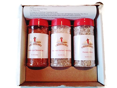 -. Binding : Misc. -. Brand : Slice and Spice -. Feature : This box comes with (3) Large Plastic Bottles / This box contains everything you need to spice up you Burgers and Fries / Each Spice will include a pairings list and hand picked recipe. / Picture shown is a representative of the packaging you will receive / Each Bottle is filled by hand with every order for a fresh product guarenteed. -. Label : Slice and Spice -. Manufacturer : Slice and Spice -. ProductGroup : Grocery -. ProductTypeName : GROCERY -. Publisher : Slice and Spice -. Studio : Slice and Spice -. Title : Slice and Spice Everyone Loves Burgers and Fries Gift Box (Set of 3 Large Plastic Bottles)