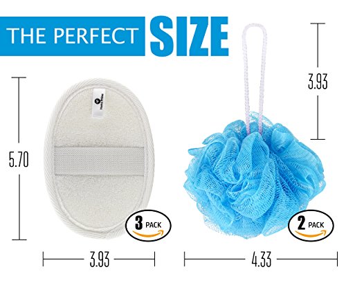 Exfoliating Shower Loofah Sponge Pads By Home Prime - 3 Pack of Loofah Sponge Pads + 2 Mesh Pouf Sponges.