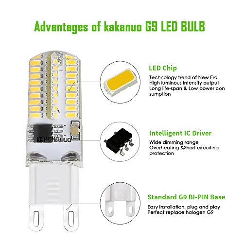 Soft Warm White linear dimmable light. Kakanuo G9 LED Bulb with 3000K color temperature. You can get stable dimming performance by a LED compatible dimmer. Otherwise, it may flicker on lower setting