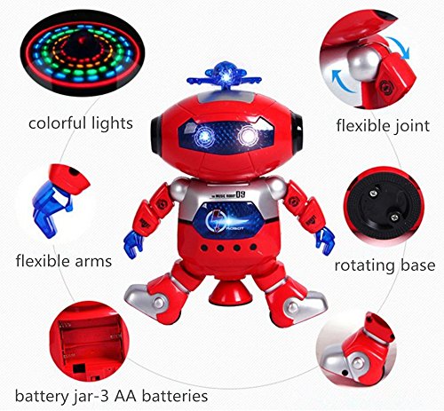 -. Feature : Small and delicate- mini size 15x7x21cm/6x2.8x8.7inch, funny toys for baby kids. / Cool and colorful light- the head, eyes and body of the robot will give out cool light and rotate to form a colorful circular, pretty beautiful. / Splendid music- the robot is inserted with wonderful music, turn on the switch, it will play music circularly and dancing with the music. / 360 degree rotation- there is a rotating base between two legs, which makes it 360 degree freely rotation when singing and dancing. / Battery operated- it needs 3x1.5V AA batteries(not included).