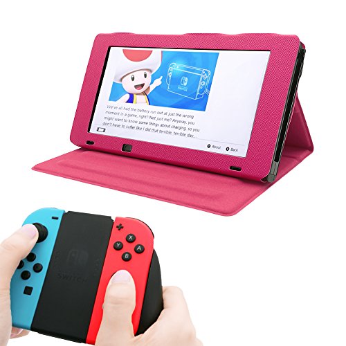-. Feature : PROTECTIVE & LIGHTWEIGHT: The premium PU leather with soft microfiber interior, prevent from finger P.R.Ints, dirt and scratches whenever its not in the dock. / 2 in 1 FUNCTIONS:Nintendo Switch holder with 3 adjustable angles give you different viewing angles for playing and watching in tabletop mode. / PRECISE CUTOUTS:Align well with the features of Nintendo Switch and allow smooth operation without removing the case.It has holes for air intakes. / COLLAPSIBLE CASE:It allows the front cover turn over to the back cover,perfect for handheld mode. / SECURE ATTACHMENT & EASY TO REMOVE:It will stay firmly in place with the secure Velcro attachment.Just open the Velcro when you want to slot into the home dock(TV mode).