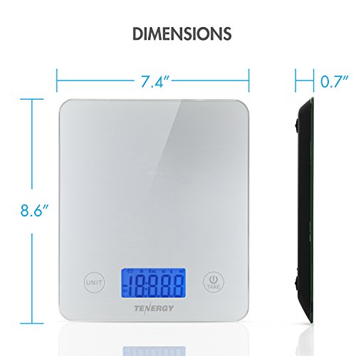 Studio : Tenergy Publisher : Tenergy Product Description Precision Weight Sensors With an accuracy of 0.1lb/1g leaving little margin for error to ensure that meals are perfectly portioned and measurements are exact. Stay on Track Portion control is crucial in losing weight or building muscle - weigh out your protein, carbs and fats to satisfy your health goals. Beautifully Durable The sleek finish of the tempered glass is easy to clean and gives the scale a modern look while also being resistant to scratches for longer durability. Easy Tare Function Reset the reading to zero after putting a container on it so that you can ONLY weigh the contents inside. Weight and Volume Conversion Switch between measurement units of weight (lb, oz, g) and volume (ml, fl oz) for your exact needs. Technical Specifications: Weighing Platform: 3mm Tempered Glass Weighing Capacity: 0.002 to 11 lb LCD Screen: 2.7 Inch Display Graduation: 0.1 lb / 1 g Units: lb oz / g / ml / fl oz Item Dimensions: 8.6 x 7.4 x 0.7 inch Item Weight: 1.1 lb Power: 3x 1.5V AAA Batteries (included) Note: For best accuracy, please lay the digital scale on hard and flat surface. Avoid soft surface. Package Contents: 1x Slim Digital Kitchen Scale 1x User Manual 3x 1.5V AAA Batteries