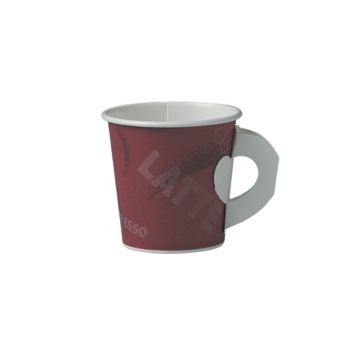 This SOLO 374SH-0041 disposable 4 oz. paper hot cup with handle and Bistro print has a polyethylene lining for resistance to leaking and moisture penetration, and a rolled rim for rigidity and strength. It is suitable for serving coffee, tea, hot chocolate, and other hot beverages. This paper cup has a handle for gripping and protection of hands from heat generated by hot beverages, and withstands beverage temperatures up to 205 degrees F. It is 2.4" high, has a 2.5" diameter, and is compatible with a SOLO VL34R-0007 lid (sold separately).