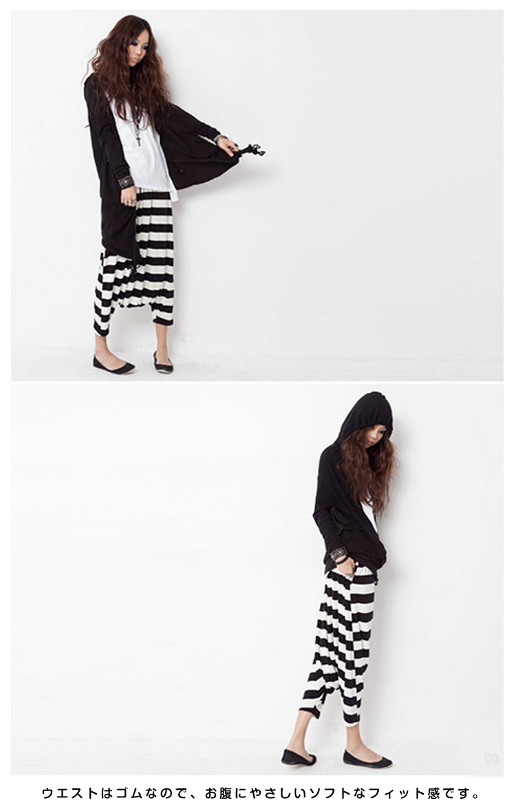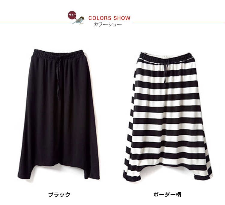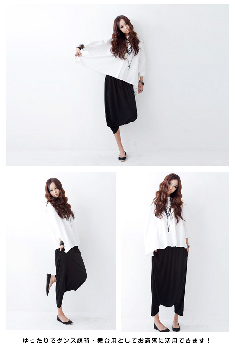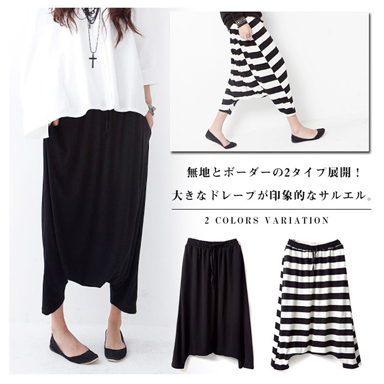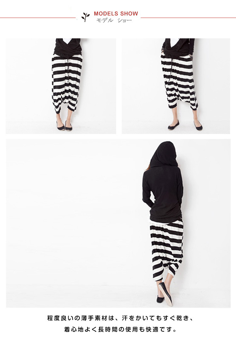| 無地とボーダーの2タイプ展開!大きなドレープが印象的なサルエル。程度良いの薄手素材は、汗をかいてもすぐ乾き、着心地よく長時間の使用も快適です。ウエストはゴムなので、お腹にやさしいソフトなフィット感です。動きやすさはもちろんのこと、シルエットも最高! ゆったりでダンス練習・舞台用としてお洒落に活用できます! | |