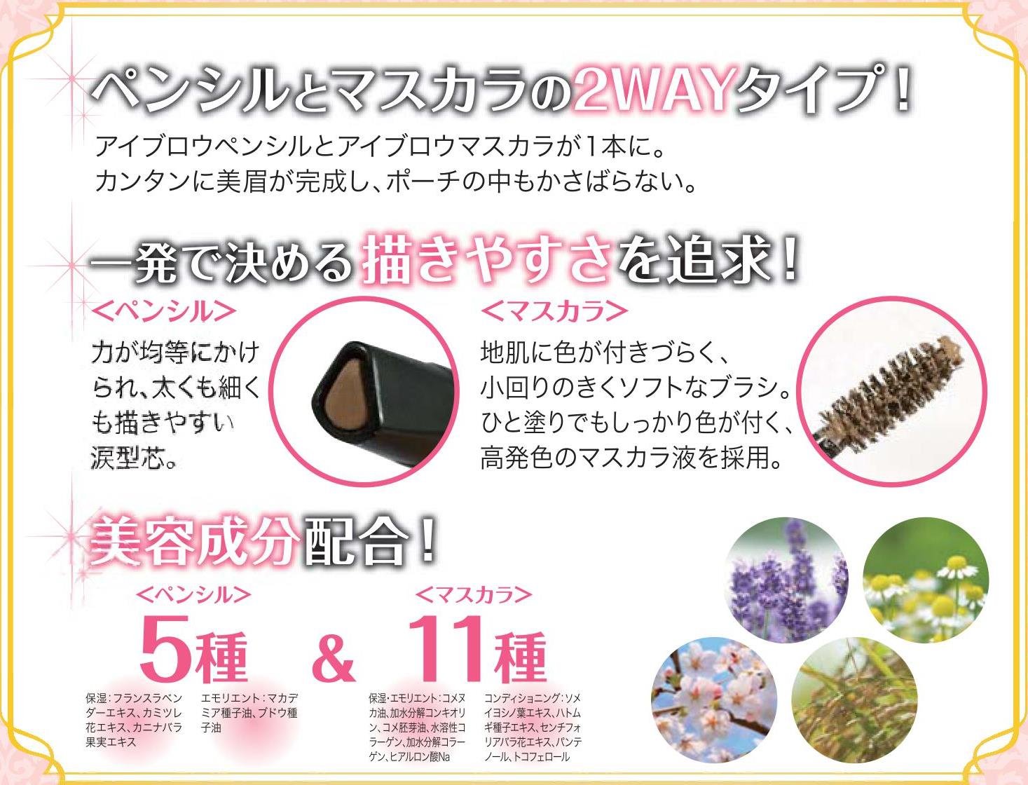 Skin care while making make-up with 5 kinds for pencil and 11 kinds for beauty ingredients for mascara.