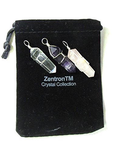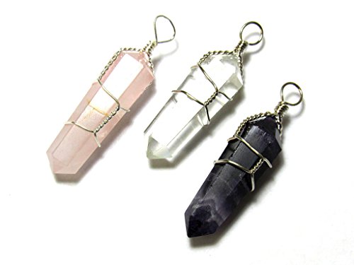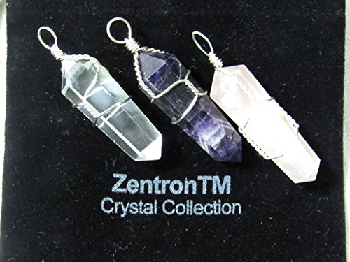 Zentron Crystal Collection: Set of 3 Pendants in Clear Quartz, Rose Quartz, and Amethyst Silver Colored Wire Wrapped