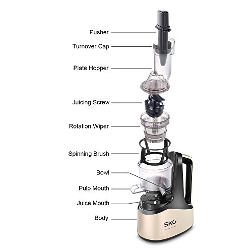 1. Non-grinding juicing method featured by slow squeezing is adopted for the product, so the natural flavor and nutrient elements of fruits and vegetables are well retained. The product has multiple functions, including making vegetable juice and fruit juice etc.