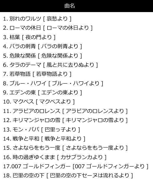 誰もが耳にした事のある懐かしい映画音楽を集めたインスト曲!「哀愁」「ローマの休日」「夜の門」他、名画の音楽に癒されるアルバムです。
