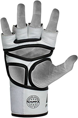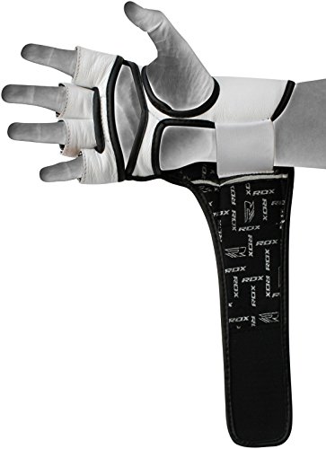 -. Feature : 100% authentic full grain cowhide leather MMA gloves are strengthened with reinforced stitching for quality / Polymax contoured Tri-Slab PC3 padding curves over knuckles to deliver efficient protection against shock-impact / Our new and improved Quick-EZ Velcro closure provides support and snug fit for wrists / Advanced inner-lining and moisture wicking microfabric expels moisture away from skin to provide ventilation and prevent odour causing bacteria from thriving / Y-Volar thumb less palm design offers superior grip and added breathability