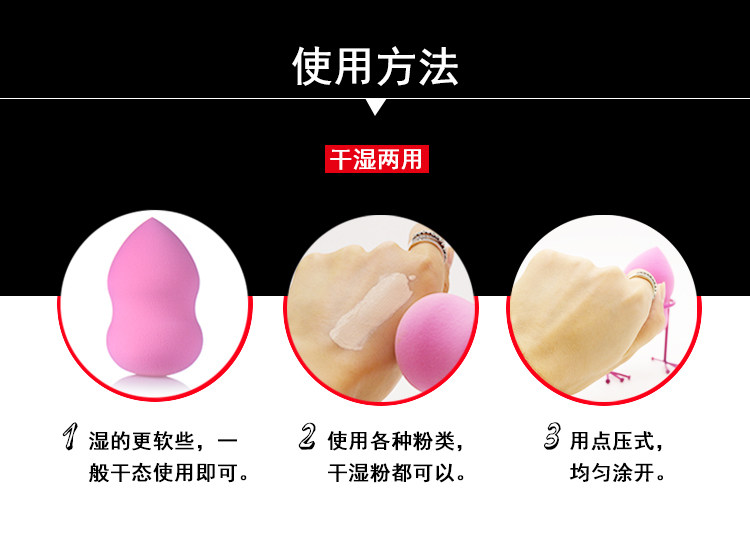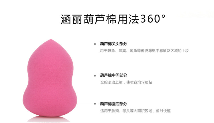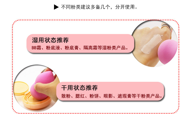 ②平时可以用来打粉底用,涂抹粉底液和隔离霜时,最后用它按压,妆会非常持久,非常贴皮肤,用宽面上脸颊等部位的妆,窄面或尖端部位可以上鼻翼眼睑等部位的妆。