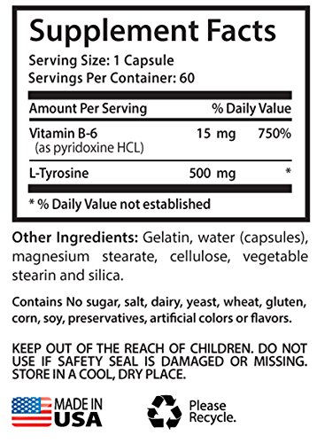 -. Feature : L-TYROSINE 500mg: This Unique Formula is naturally derived. Its P.R.Imary Ingredients Include: L-Tyrosine and Vitamin B6. Our product DOES NOT CONTAIN - Sugar, Salt, Dairy, Yeast, Wheat, Gluten, Corn, Soy, Preservatives, Artificial Colors and Flavors. Supplement Facts: Serving Size 1 Capsule. Servings Per Container 60. / L-TYROSINE 500mg: Researchers say that tyrosine directly affects the brain and it appears to preserve working memory during acute stressors. Tyrosine has potential to effectively improve cognition during acute stressors. Also, there appears to be an increase in subjective well being during stress when Tyrosine is preloaded. Perceptions of stress during acute stressors, as well as related symp of acute stress, appear to be reduced following Tyrosine ingestion. / L-TYROSINE BENEFITS: Tyrosine is used in protein supplements. Researchers say that tyrosine directly affects the brain. Tyrosine is also a pigment imparting agent for the human skin. / OTHER L-TYROSINE BENEFITS: There are multiple reasons to consume Tyrosine as dietary supplement and its benefits will Improve your Mood and Feeling of Subjective Well-Being, Enhance Cognitive Function When Exposed to Stress, Improve Stress Response,Improve Attention and Wakefulness. Lastly, Feeling of being Burned Out. / OUR GUARANTEE: (3 Bottles - 180 Capsules) We at SPORT SUPPLEMENTS use only premium available ingredients. Our product is proudly Made in USA at FDA approved facility and followed by strict GMP guidelines. Your Sataisfaction is important to us. 30 Days Money Back Guaranteed!