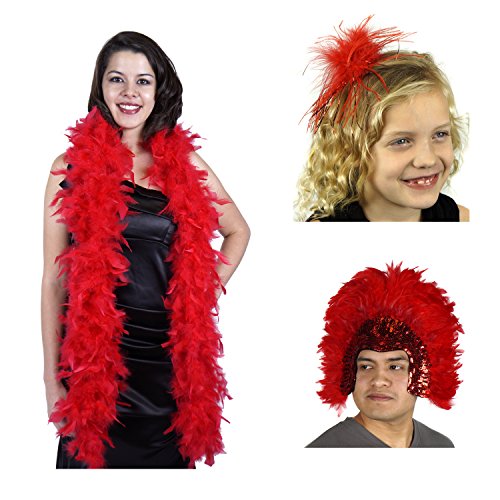 Product DescriptionSet includes 1 Feather Boa, 1 Feather Hair Tie and 1 Feather Headdress - Red0