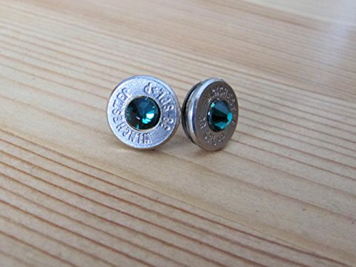 -. Title : 38 Caliber Bullet Earrings with Emerald Swarovksi Crystal Accents - May Birthstone Bullet Jewelry