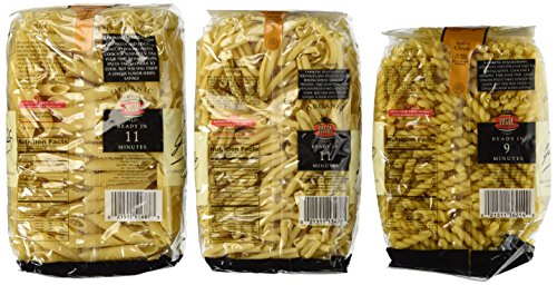 -. Feature : Made in Italy. / Gemelli (ready in 9 minutes) ; Casarecce (ready in 11 minutes) ; Penne (ready in 11 minutes) / 100% Organic Certified 6 Variety Pack / The pasta is made of 100% organic durum wheat semolina flour / 2 Bags of Each. Net Wt Each 17.6 Oz (500g)