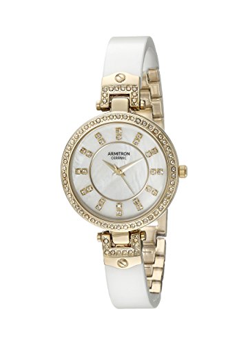 Gold-tone bezel and lugs set with 90 Golden colored Swarovski crystals; mother-of-pearl dial with gold-tone hands and 24 Swarovski crystal markers