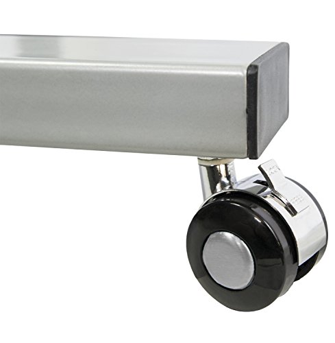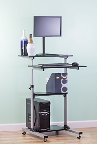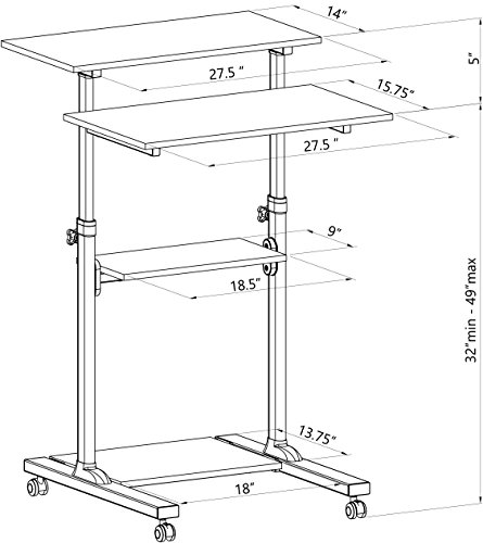 -. Feature : Ergonomic height adjustable station from sitting to standing position (11 different locking intervals) / Four spacious platforms (Top monitor shelf, slightly lower key board shelf, middle shelf, and base shelf for pc tower, P.R.Inter, speakers, etc..) / Max Total Recommended Weight = 132lbs (not recommended to exceed 33lbs per shelf). / Stationary wheel locking casters / Easy Maneuverability ( 27.5" total front width and 28" total side length)