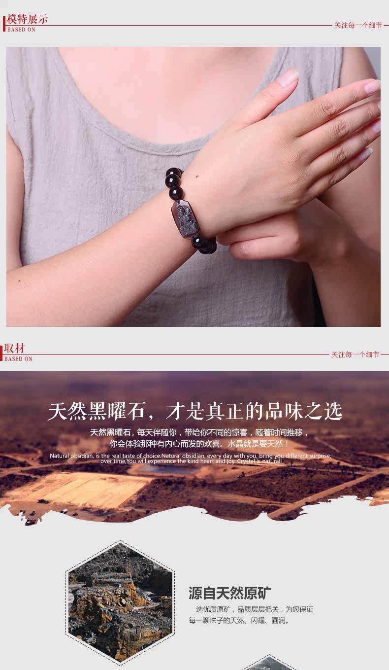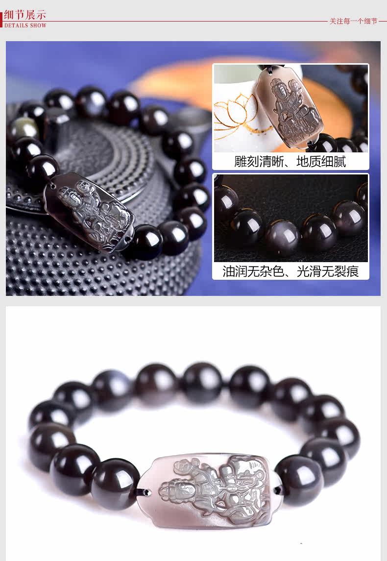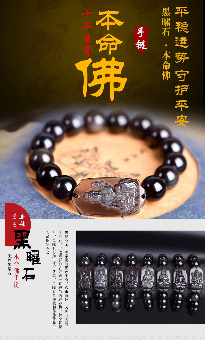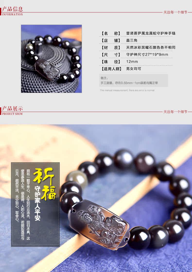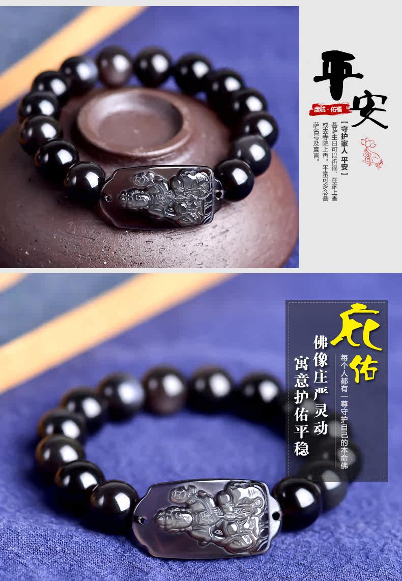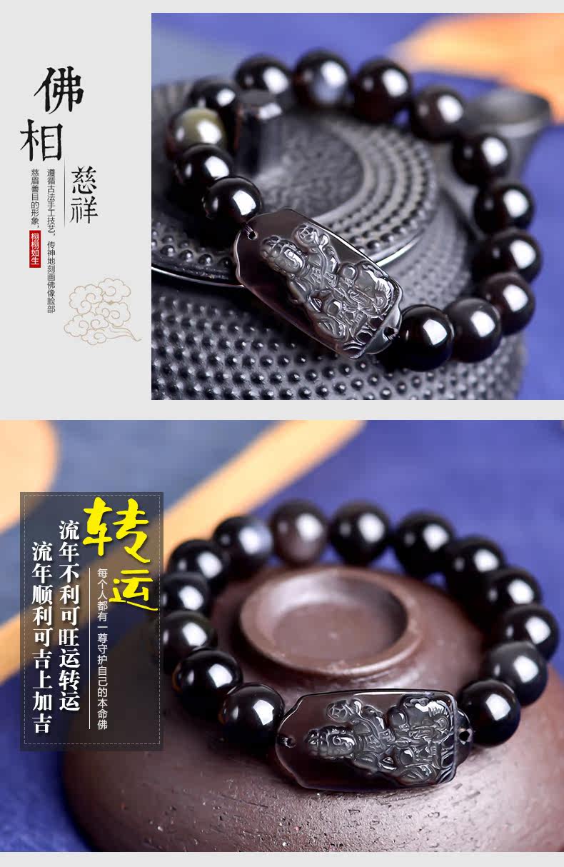 开光 天然冰彩黑曜石普贤菩萨手链 生肖龙蛇守护神本命佛男女饰品