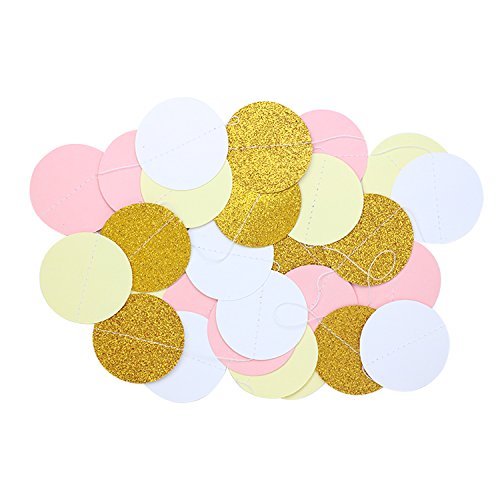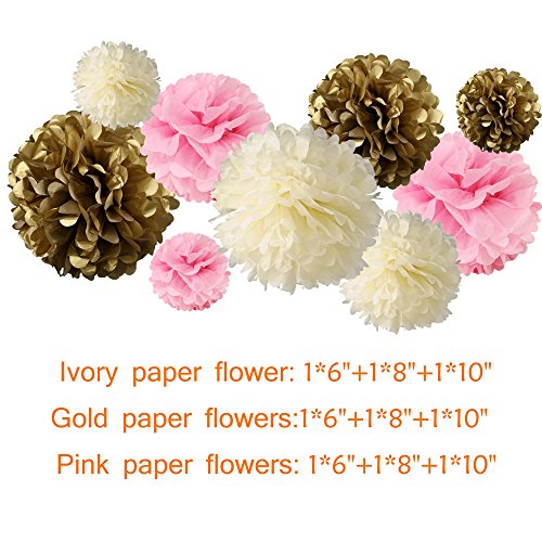SIZE & COLOR -tissue paper flowers including ivory, gold and pink, (3*6",3*8"and 3*10");paper lanterns including cream(2*6"), gold(2*8") and pink(2*10");10 feet circle paper garland: within pink, white, gold glitter mixed color