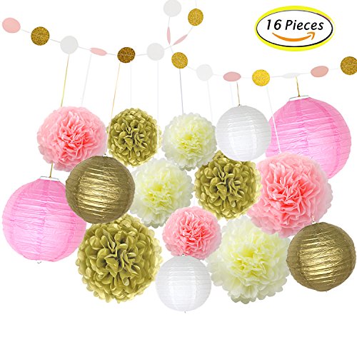 16Pcs Tissue Gold Ivory and Pink Paper Pom Poms Flowers and Paper Lanterns Birthday Wedding Party Decoration