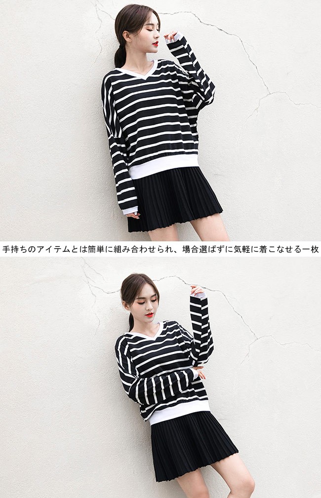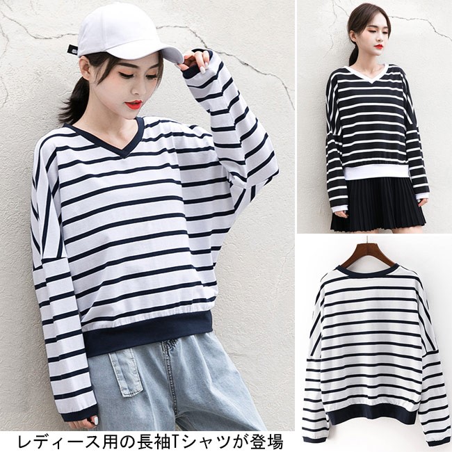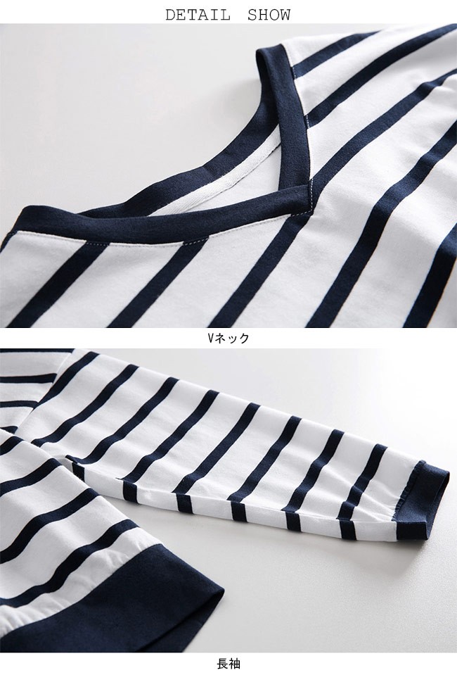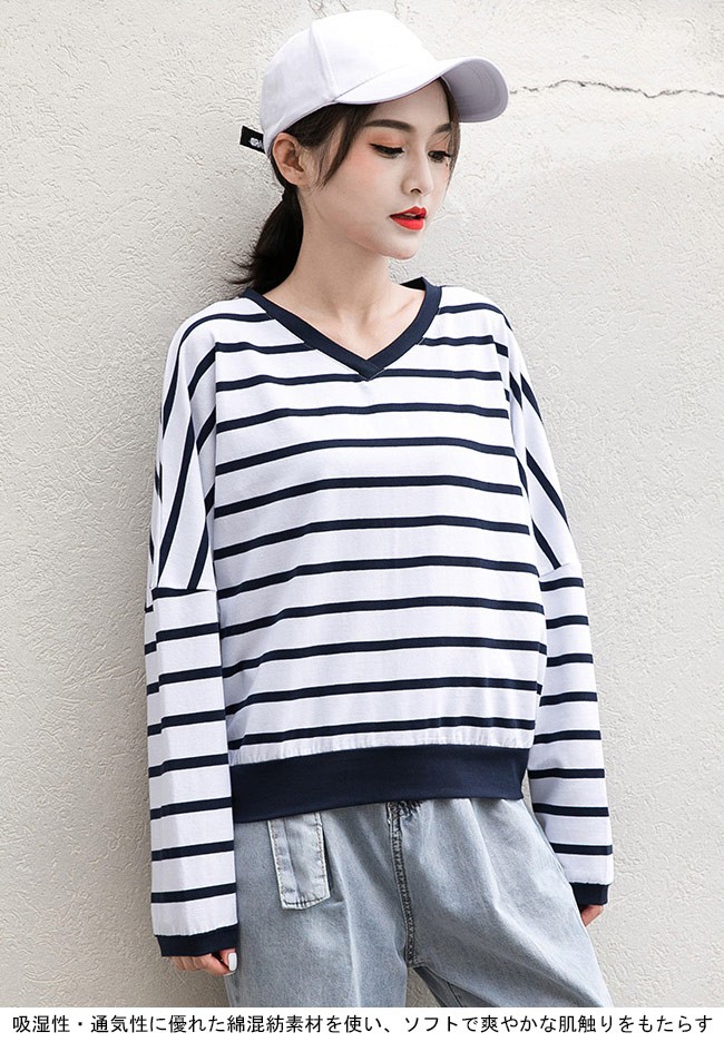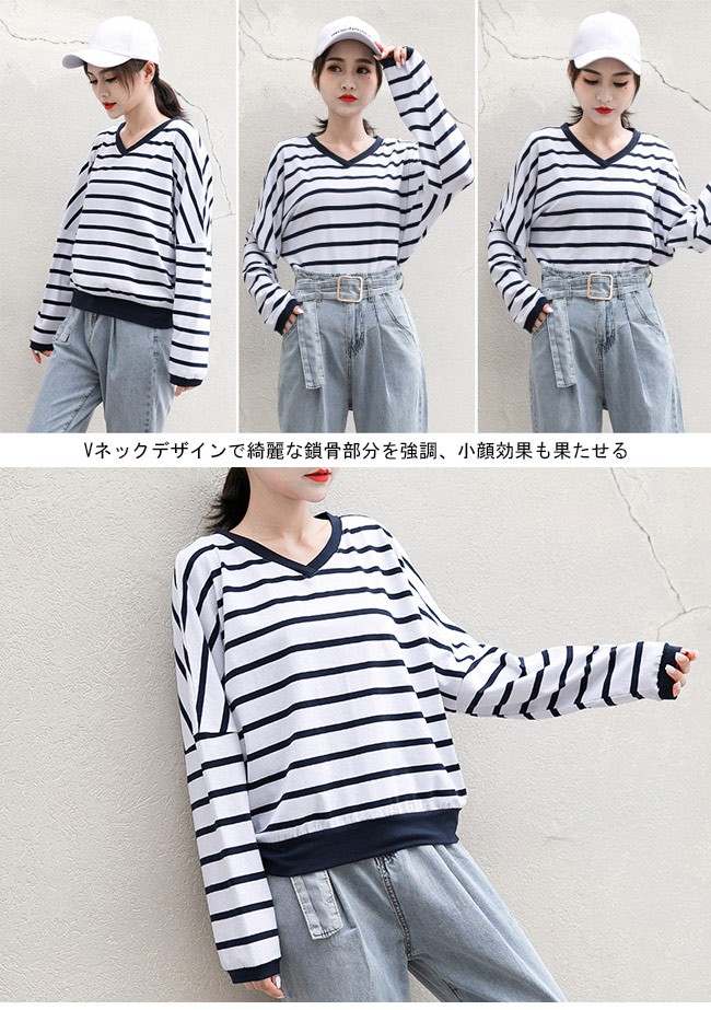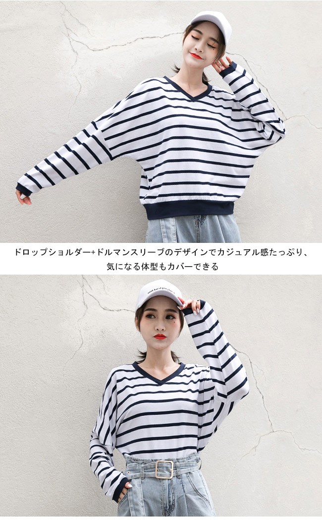 長袖Tシャツ ドルマンスリーブ レディース Vネック ボーダー柄 Tシャツ 体型カバー 長袖 女性用 トップス カジュアル ドロップショルダーレディース用の長袖Tシャツが登場吸湿性・通気性に優れた綿混紡素材を使い、ソフトで爽やかな肌触りをもたらす定番のボーダー柄にトレンディーな配色はシンプルでオシャレVネックデザインで綺麗な鎖骨部分を強調、小顔効果も果たせるドロップショルダー+ドルマンスリーブのデザインでカジュアル感たっぷり、気になる体型もカバーできるそのまま着ても、インナーとしてアウターとのコーデも十分に楽しめる手持ちのアイテムとは簡単に組み合わせられ、場合選ばずに気軽に着こなせる一枚カラー:1 2素材 綿混紡サイズ(cm) M LM 着丈55 バスト150 肩幅84L 着丈58 バスト156 肩幅87ご注意:※サイズは平置きサイズです。素人採寸ですので、若干の誤差がございます、ご了承ください。