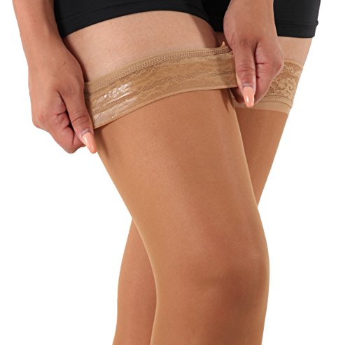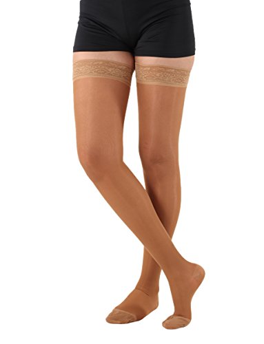 Sheer Support Thigh High With Lace Top 20-30mmHg Compression Sheer Support Thigh-Hi w/Lace Top 20-30 Compression. Made In USA sold per pair. These sheer thigh high are designed to help restore leg health and reduce leg discomfort. They provide long-lasting medical-grade support, yet have a sheer look and feel that appeals to today's active, fashion conscious woman - excellent for business or casual wear. Made with 80% Nylon, 20% DuPont Lycra Spandex