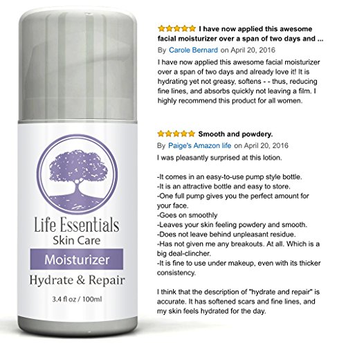 -. Feature : Life Essentials Moisturizer aids in re-hydrating and repairing your skin. Professionally proven to restore and re balance your skins natural ability to maintain and produce moisture even for the most sensitive skin types / YOU WILL LOVE THE RESULTS: Life Essentials Moisturizer has active ingredients that will boost collagen production to improve the health of your skin / HIGHEST QUALITY OF ORGANIC INGREDIENTS: Formulated with all natural, organic & vegan ingredients. Life Essentials Moisturizer is professionally proven to repair, heal and improve your skin / MADE IN THE USA: As with all of our products, Our Moisturizer is proudly formulated here in the USA in an FDA registered laboratory & is cruelty free - (we never have & never will test our products on animals). / OUR 100% SATISFACTION GUARANTEE: As a family company, we only produce products we are proud to use ourselves. We know you will love our Moisturizer, but if for any reason you are unsatisfied with your purchase, just contact Life Essentials Skin Care for a full refund, no questions asked and no need to return the product.