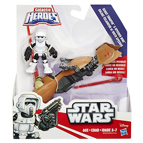 -. Binding : Toy -. Brand : Playskool -. EAN : 0630509294404 -. Feature : COME TO THE DARK SIDE - Help this Scout Trooper figure ride his Speeder Bike vehicle through the thick trees of Endor and launch a projectile. The adventure is up to you. / ADVENTURE AWAITS - Young Jedi can take adventures into their own hands with the Star Wars Galactic Heroes figures. Ignite their imaginations and bring a galaxy far, far away right into their world. / STAR WARS GALACTIC HEROES - Scout Trooper can move arms and ride on a super cool bike with wheels that spin. Plus young Jedi can launch a missile to the enemies. / CREATIVE ROLE PLAY - This Star Wars toy can help encourage children to use their imagination by engaging in pretend play. They can go on intergalactic adventure with this Scout Trooper figure. / PACKAGE INCLUDES - 1 Scout Trooper figure, 1 Speeder Bike vehicle, and 1 projectile. -. IsAdultProduct : 0 -. Label : Star Wars -. Manufacturer : Star Wars -. Model : B2035AS0 -. MPN : B2035AS0 -. PackageQuantity : 1 -. PartNumber : B2035AS0 -. ProductGroup : Toy -. ProductTypeName : TOYS_AND_GAMES -. Publisher : Star Wars -. Studio : Star Wars -. Title : Playskool Heroes Star Wars Galactic Heroes Speeder Bike and Scout Trooper -. UPC : 630509294404 -. Warranty : No Warranty