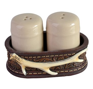 Western Stitched Leather & Antler Look, Salt Pepper Shaker Set, 4.5-inch, Rustic