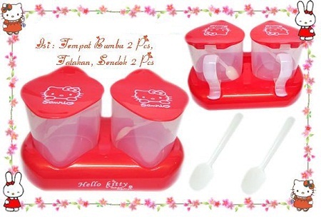 Tempat / wadah bumbu2 keperluan dapur hello kitty sebagai tutupnya sehingga bumbu akan aman dan awet,dilengkapi dengan sendok takarnya sehingga me.mudahkan anda dalam mengukur bumbu masakan yg akan anda gunakan.