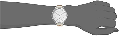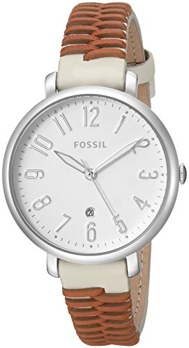 The Fossil Jaqueline Whipstitched Leather Strap watch features a beige leather strap with brown leather whip-stitching and a stunning white dial with silver-tone details.
