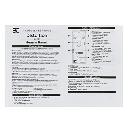 Studio : EX-AMP Publisher : EX-AMP Product Description Feature:* A high gain distortion sound with powerful mid frequency* With 3 functional knobs, Level knob/ Tone knob/ Dist knob, to control the performance of the distortion sound.* LED indicator instructs effects or bypass status of Classic effect, when the led is lit up, the effects is on.* Small and exquisite design with full metal shell.* True bypass style, with durable jacks and foot switch.* Can be used Negative DC 9V as Power Supply.Specification:Classic Distortion Effects PedalInput: 1/4" mono jack (impedance: 1M Ohms)Output: 1/4" mono jack (impedance: 1k Ohms)Power Requirements: AC adapter 9V DC (center minus plugCurrent Draw: 7 mADimensions: 93.5mm x 42mm x 52mmAccessories: Owner's ManualPlease Read Manual Before Operating.Package Includes:1 x Classic Distortion Effects Pedal1 x Manual1 x Bag1 x Patch Cable 0