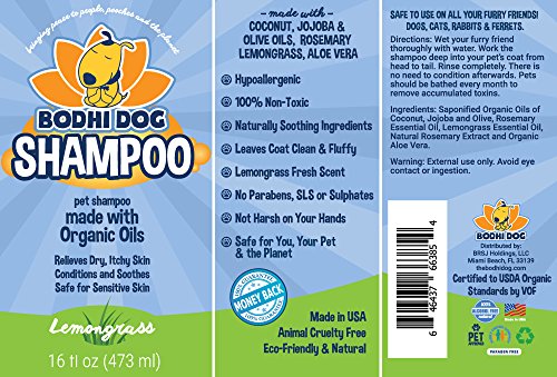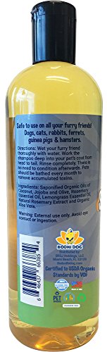 - MADE WITH CERTIFIED USDA ORGANIC OILS: Our vegan pet shampoo is hand-crafted in small batches using high quality USDA Certified Organic Oils and all natural essential oils. Our soothing pet shampoo contains organic aloe vera, organic oils of coconut, jojoba and olive, essential oils of rosemary and lemongrass. Our all plant blend is safe for you and your pet and is packed full of vitamins and minerals essential for healthy skin and beautiful coat.
