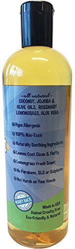 - LEMONGRASS FRESH SCENT: A wonderful fresh aroma makes bath time a pleasant experience for you and your pet! Our shampoo has a light lemongrass scent that leaves your pet smelling fresh for days. It is not harsh on your hands and works as aromatherapy for you while bathing your pets because of the natural essential oils. Your hands will be soft and smell great afterwards too! It contains Lemongrass essential oil which has natural antiseptic.